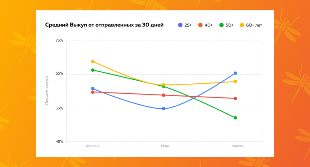 Этот график нам говорит не только о том, кто перестал ходить на Почту. Он нам показывает интересный спад в марте, когда всё только начиналось. В этот период аудитория 60+, 50+, да и 25+ резко перестали ходить и забирать свои посылки. Да, изменения на несколько пунктов, но для магазинов это существенные потери.