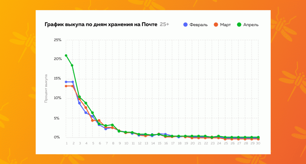 Молодые пользователи больших интернет-магазинов в возрасте 20–45 лет стали активнее заходить на почту и быстрее выкупать свои товары — особенно в день доставки посылки в отделение. Если сравнивать месяц к месяцу, то в апреле крупным интернет-магазинам, которыми пользуются в основном молодые люди, удалось отыграть мартовское падение выкупа и даже увеличить продажи.