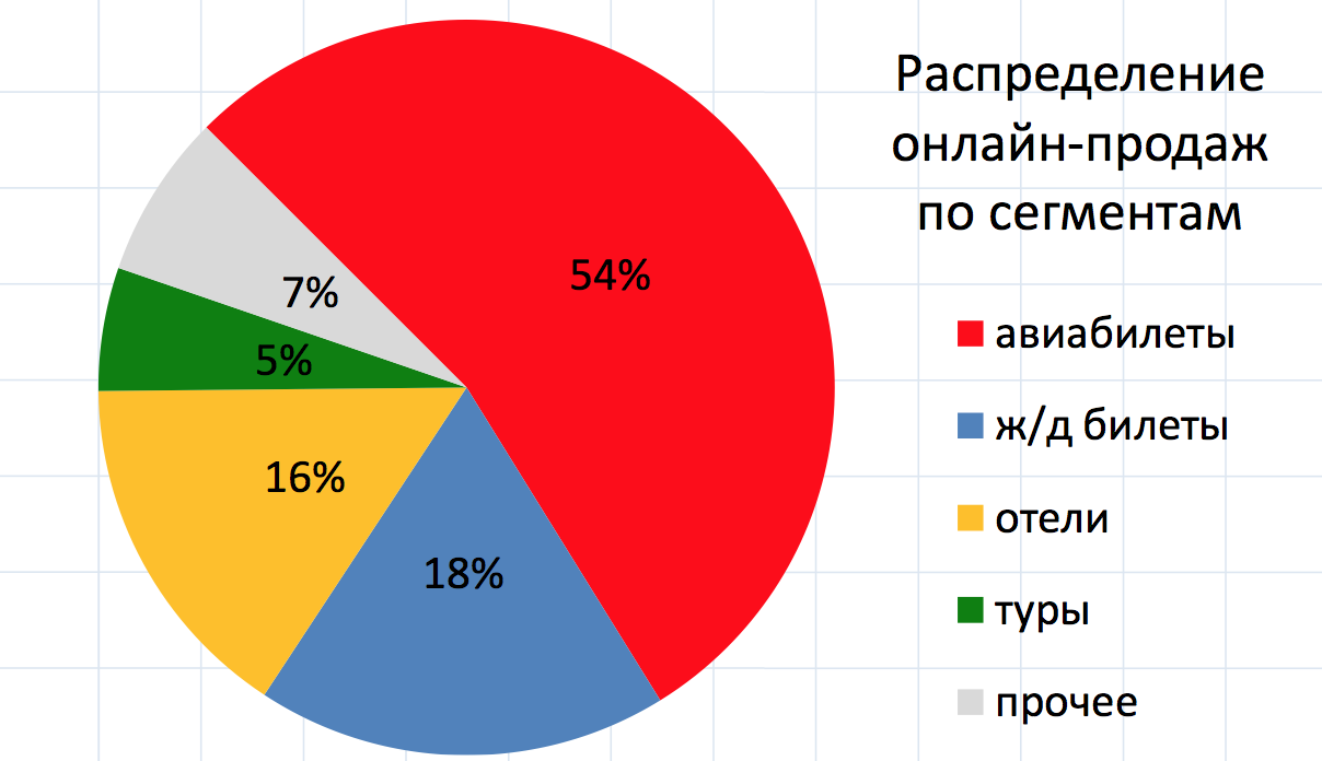 В данном сегменте наиболее популярным товаром у онлайн-покупателей являются авиабилеты: их доля в общем объеме продаж составляет 54%. В тройку самых востребованных категорий вошли железнодарожные билеты (18%) и отели (16%). Меньшей популярностью у россиян пользуются туры, доля которых оценивается в 5% рынка.