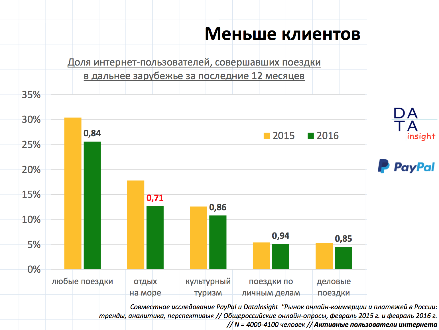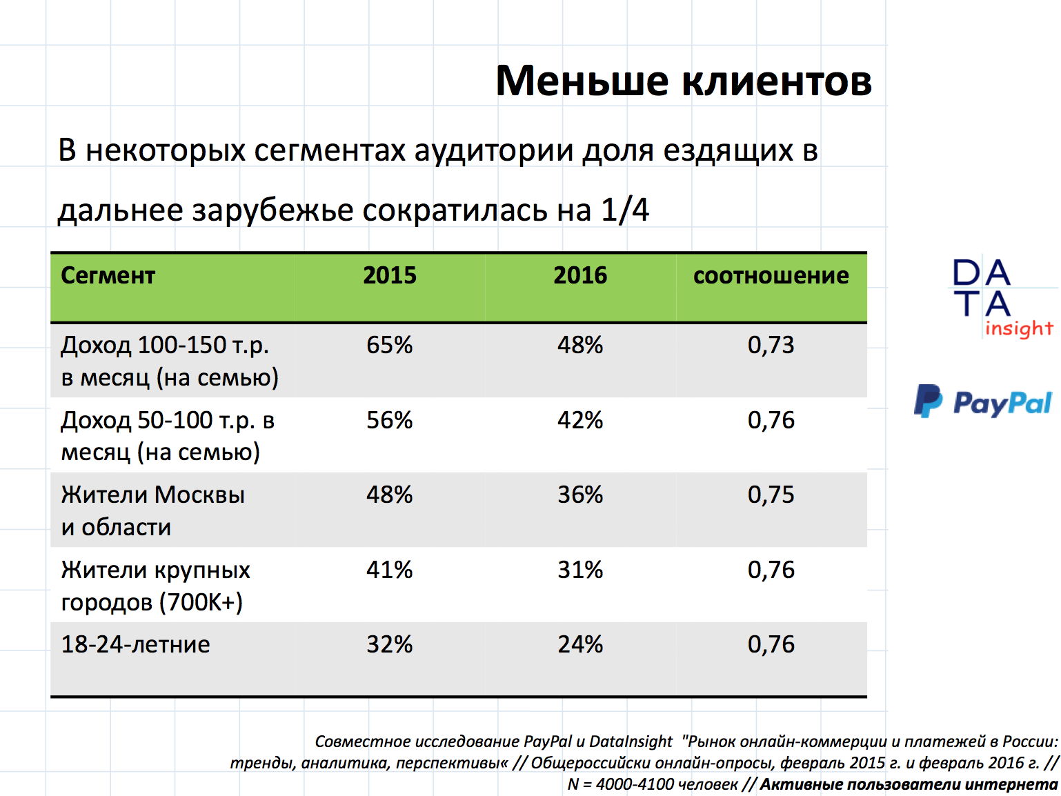 При этом в некоторых сегментах аудитории доля покупателей, выезжающих за рубеж, сократилась на четверть. Больше всех "пострадали" пользователи с ежемесячным доходом 50-100 тыс. рублей на семью, жители городов с населением более 700 000 человек и молодые люди от 18 до 24 лет.