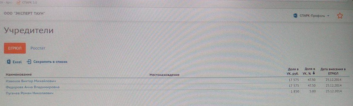 Согласно справочно-информационной системе СПАРК, В.М.Извеков владеет 47,5% уставного капитала компании. Еще двумя учредителями и совладельцами ООО «Эксперт Таун» являются А.В. Федорова (тоже 47,5%) и Р.Н. Пугачев (5%).