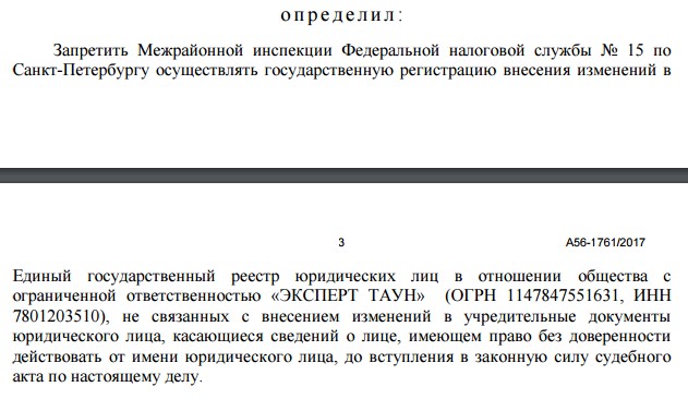 25 января 2017 года судья Арбитражного суда города Санкт-Петербурга и Ленинградской области Щуринова С.Ю., рассмотрев заявление Извекова, посчитала его обоснованным и подлежащим удовлетворению. Она приняла решение запретить Межрайонной инспекции ФНС вносить изменения в ЕГРЮЛ. Также принято решение возбудить производство по делу и назначить первое судебное заседание арбитража на 7 марта.