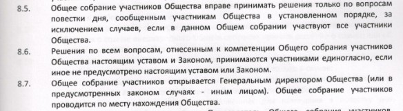 В нашем распоряжении оказалась копия Устава ООО «Эксперт Таун». В учредительном документе содержится положение, устанавливающее, что принятия решения по вопросам, относящимся к компетенции Общего собрания, должны приниматься единогласно (п. 8.6. Устава).