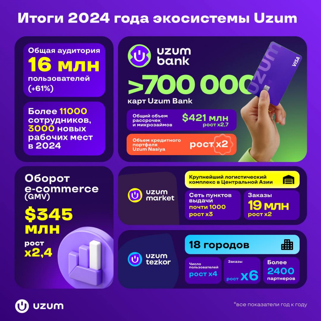 Развитие финтех-сервисов стало одним из ключевых драйверов роста. Объем кредитного портфеля Uzum Nasiya вырос более чем вдвое. Uzum Bank запустил карту международной платежной системы Visa с возобновляемым лимитом, который можно использовать для микрозаймов или покупок в рассрочку. К концу 2024 года было выпущено более 700 тысяч карт Uzum, а до конца 2025 года планируется кратное увеличение эмиссии.