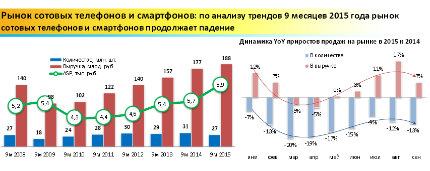 - За 9 месяцев 2015 на российском рынке было продано около 18 млн смартфонов, что на 6% меньше, чем за 9 месяцев 2014. Рынок смартфонов в денежном выражении вырос на 10% – до 171 млрд. руб. Средняя цена выросла на 17% – до 9 700 руб. Пик падения пришелся на март – апрель 2015. Единственным месяцем, где рынок показал положительную динамику год к году, был январь, ставший, в принципе, аномальным для этого периода