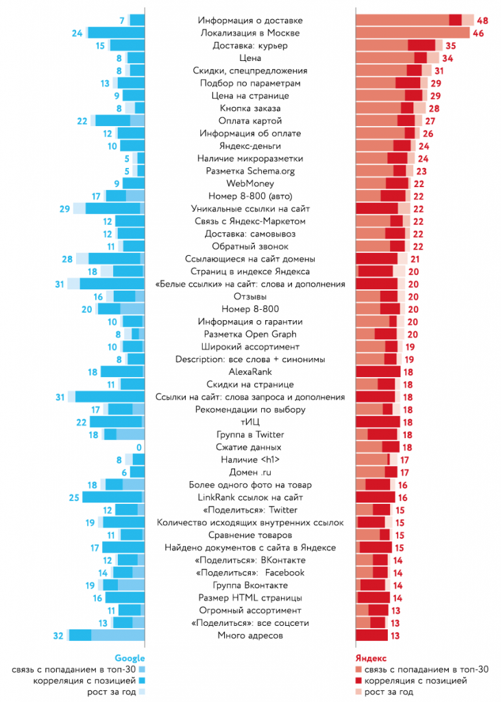 В Яндексе везде есть не только связь с попаданием в топ-30, но и корреляция с позицией. У параметров, связанных с безналичной оплатой, корреляция за год выросла, и ее уже можно назвать сильной, причем вырос также разрыв между топ-30 Яндекса и фоном.
