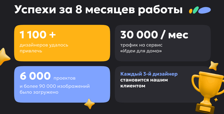 Раздел "Идеи для дома" пополнился огромным количеством проектов, которыми ежедневно вдохновляются тысячи наших пользователей. Рекламу ему создает наш собственный журнал с рум-турами и соцсети компании, что позволяет минимизировать маркетинговые расходы.
