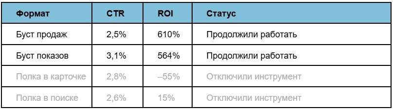 Проанализировав эффективность каждого из них, отказались от малоэффективных форматов и сосредоточились только на «Бусте показов» и «Бусте продаж». Это позволило достичь общего значения ROI в 587%.