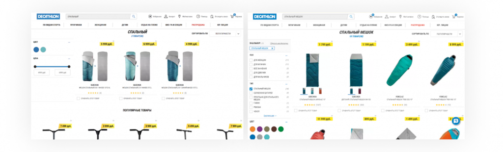 При работе над магазином Decathlon мы провели исследования обоих типов, в том числе опросы респондентов из разных целевых сегментов клиента. После глубинных интервью мы проводили UX-тест: давали респондентам задания, которые соответствуют их обычному поведению на сайте, исходя из их потребностей. Например, тем, кто увлекается сноубордом, предлагали поискать элементы экипировки. Для проведения UX-теста все респонденты делились на 2 группы: половина тестировала десктопную версию сайта Decathlon, половина — мобильную.