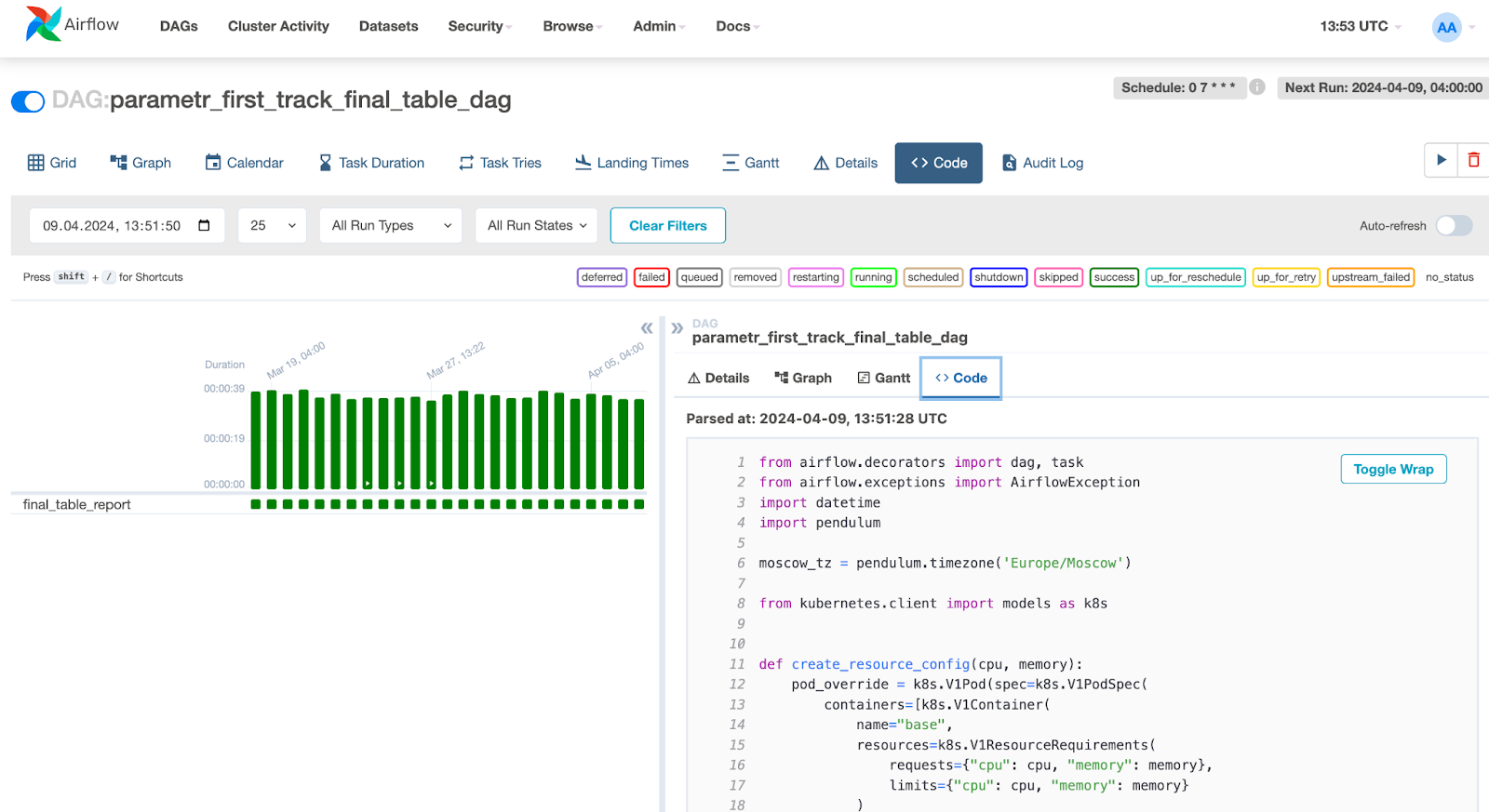 5. Автоматизировали обновление данных. Мы написали скрипт, который загружал полученные данные в базу данных. А далее настроили их обновление. С этой задачей нам помог справиться Apache Airflow — инструмент с открытым исходным кодом, который запускал наш код каждые сутки в 7 часов утра. Таким образом, клиент всегда видел актуальные данные.
