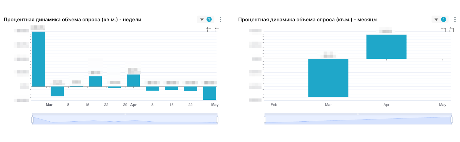 Далее следуют диаграммы с динамикой лидов и объема спроса в процентах. Если значение выше оси X, значит, динамика относительно прошлой недели или месяца была положительная, если ниже — отрицательная. А сам коэффициент изменения указывается в процентах.