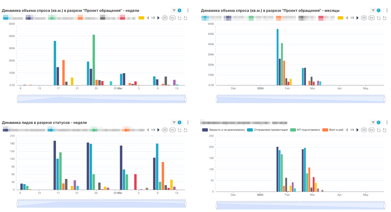 Под ними группа диаграмм с динамикой по лидам и объемом спроса с группировкой по проекту и по текущему статусу сделки. По оси Х идет временная шкала или дата с шагом неделя и месяц. По оси У — объем спроса в кв.м. или количество лидов.
