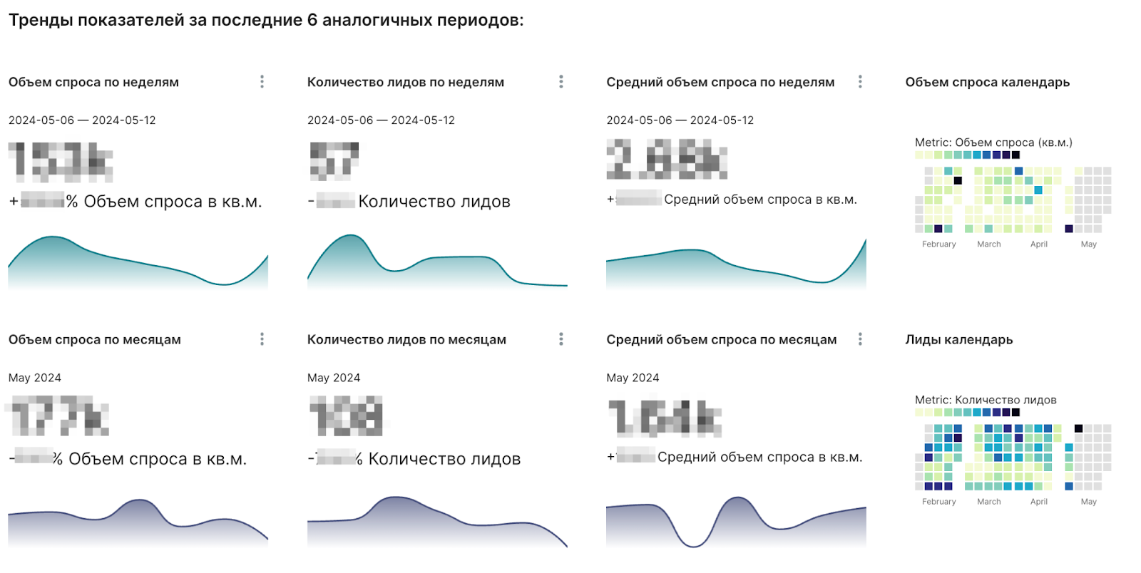 Следом расположен блок с количеством лидов, объема спроса и их трендами. А также тепловые карты в виде календаря, которые показывают, в какие дни было больше лидов и больший спрос: