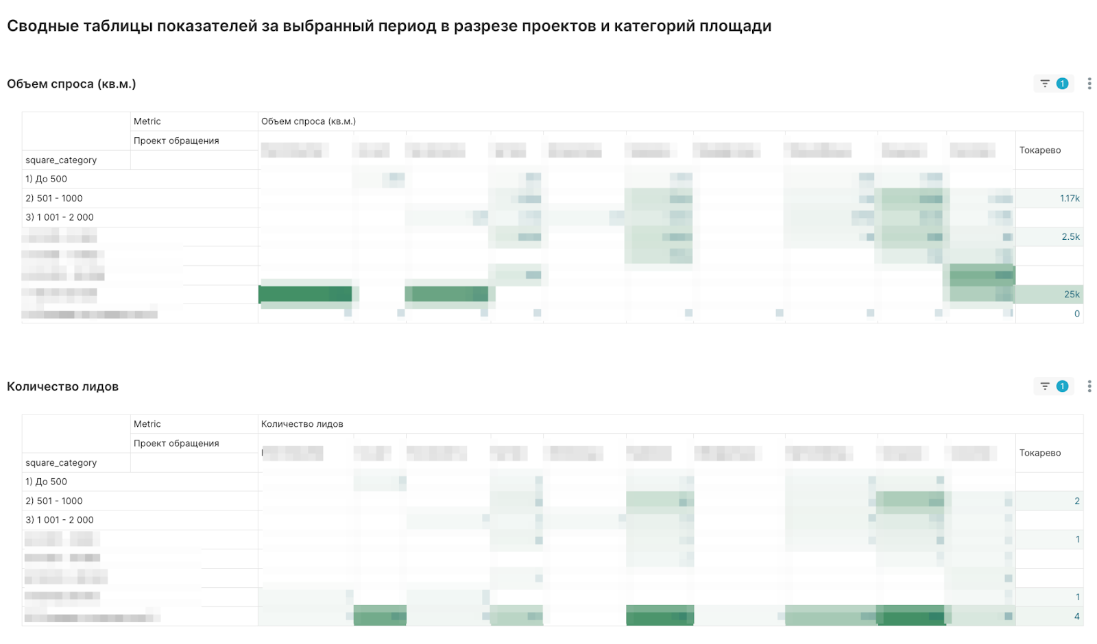 Продолжает дашборд группа из нескольких сводных таблиц с данными по лидам и объему спроса на пересечении проекта и класса площади: