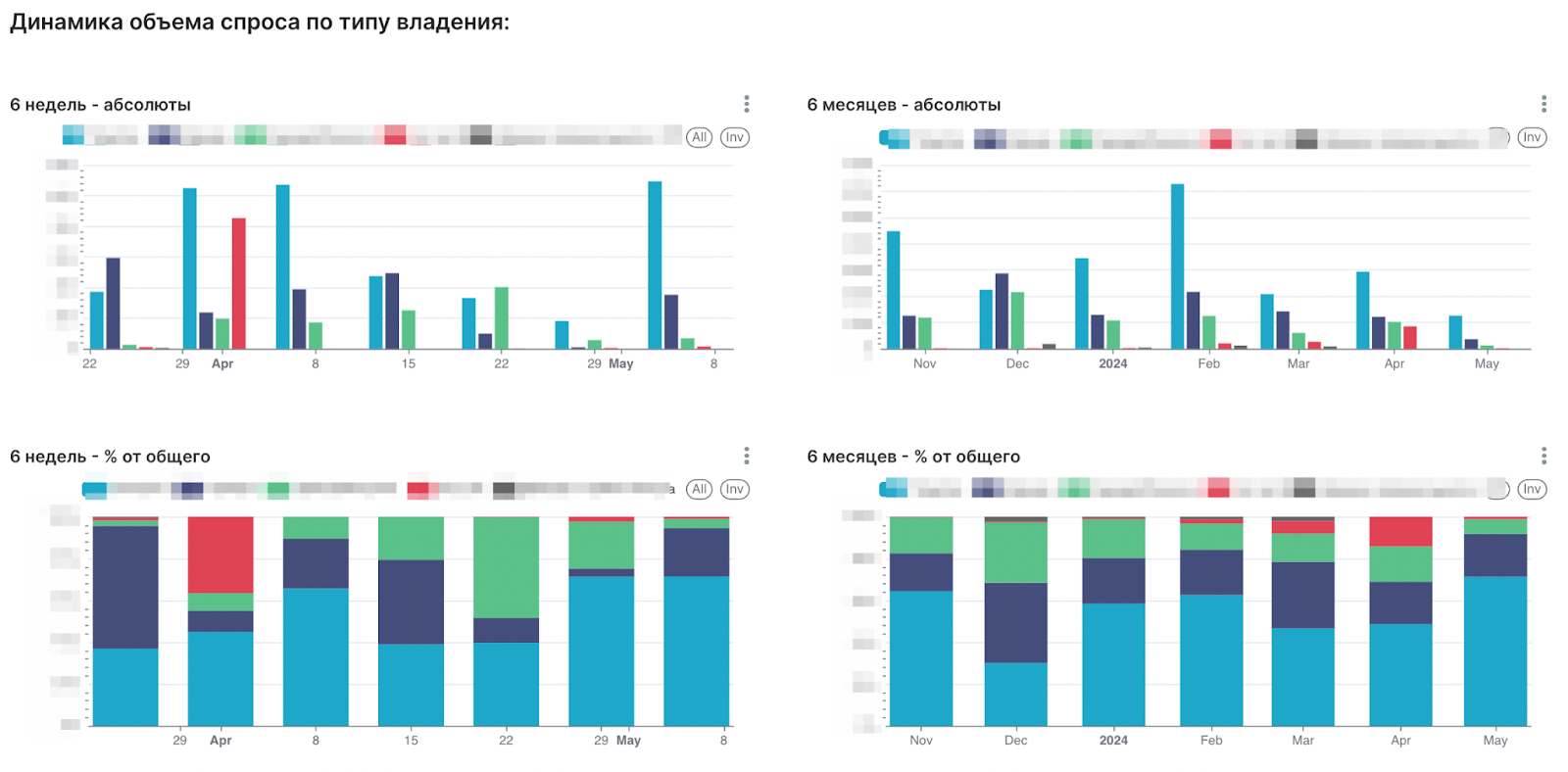 Под ними следуют диаграммы показателей продаж с разными группировками. Например, на следующем скриншоте изображен фрагмент диаграмм изменения объема спроса по неделям и месяцам с группировкой по типу владения — аренда, выкуп и т.д. А также диаграммы с процентным соотношением каждого из элементов группы.