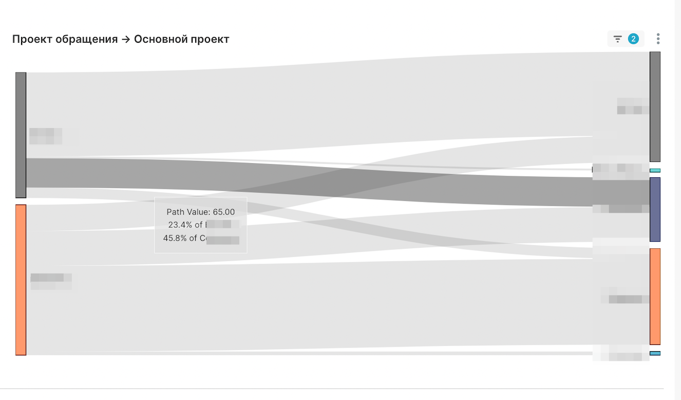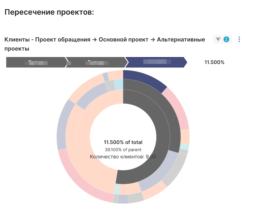 Например на скриншоте ниже изображен график “sunburst” (диаграмма, похожая на солнце с ветвящимися лучами). Его внутреннее кольцо — проект обращения, среднее кольцо — основной проект, а наружнее кольцо — альтернативные проекты. Здесь можно увидеть, что из всех пользователей, которые обращались по проекту А, только 11.5% (или 9 человек) рассматривают проект Б как альтернативу. Эта же диаграмма показывает, какой процент клиентов пока не изменяет проект обращения на другой, а какой процент людей вообще не рассматривает альтернативы.