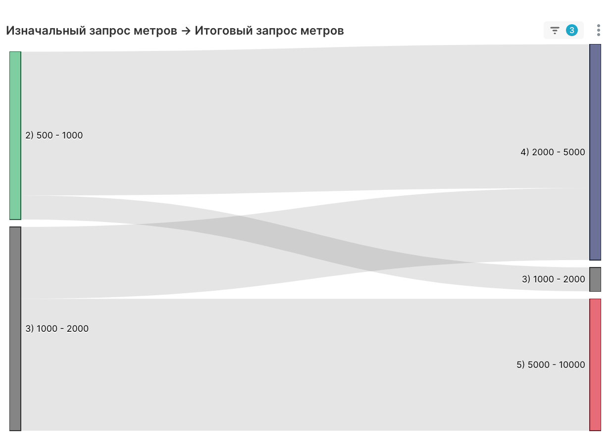 Компания также хотела видеть в дашборде, как менялись предпочтения клиентов по площади помещений в процессе общения с менеджерами. Это нужно было, чтобы понять, насколько эффективно работает отдел продаж, получается ли у менеджеров увеличить стоимость сделки и, соответственно, прибыль для бизнеса.