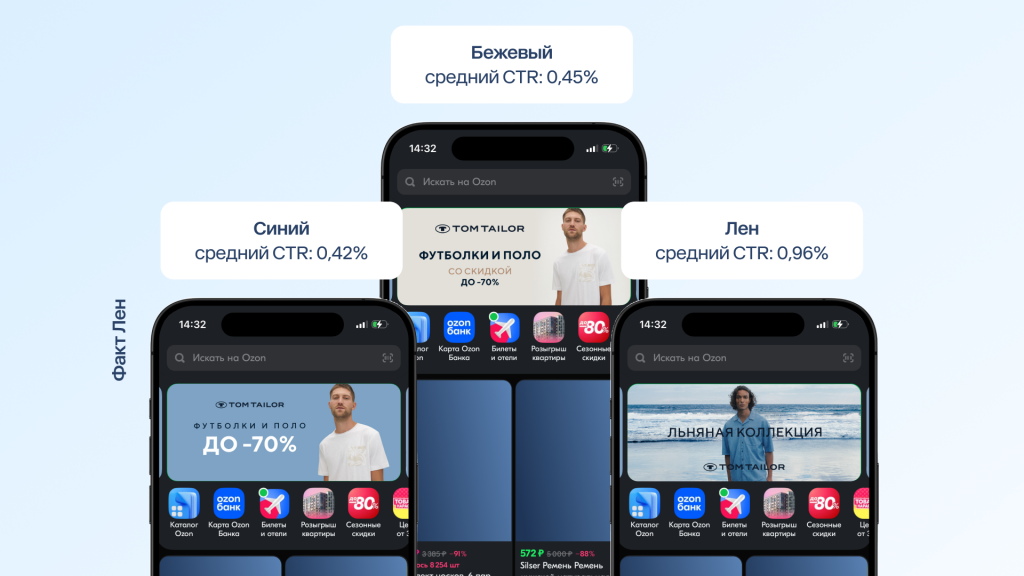 Для продвижения выбрали приоритетные для компании товары - футболки и поло, коллекцию одежды из льна. Каждый креатив запускали в нескольких вариантах - это помогло найти баннеры, которые дают высокую конверсию, и отключить малоэффективные.