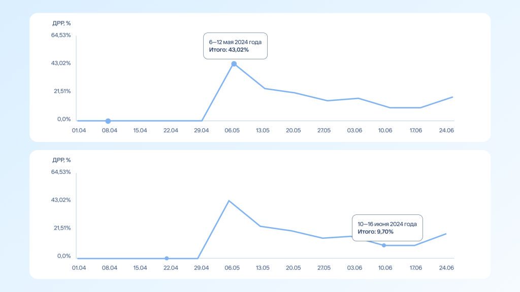 Помогли клиенту заметно снизить долю рекламных расходов (ДРР). На графиках показано сравнение ДРР до и после имплементации - разница почти в 4,5 раза.