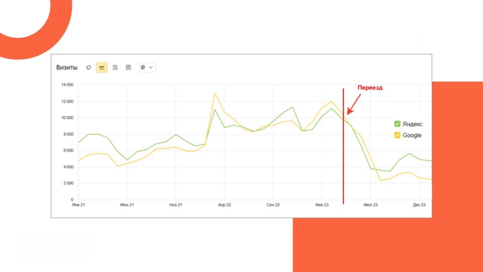 Клиент пришел к нам на SEO спустя почти год после переезда. Да, часть позиций ушла безвозвратно, но трафик еще можно было спасти.