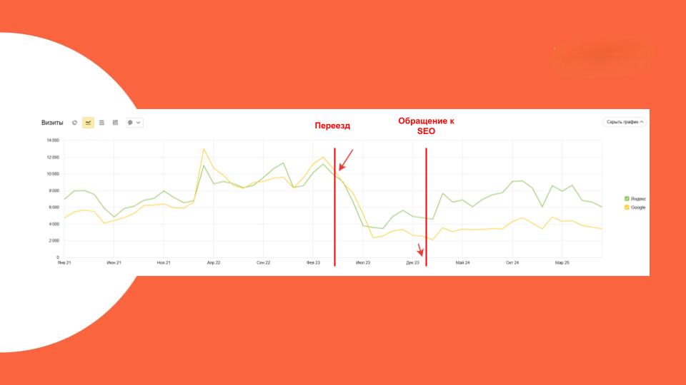 Сравнивали текущий трафик с данными 2022 года (до переезда), чтобы видеть реальный прогресс с учетом изменений спроса в нише.