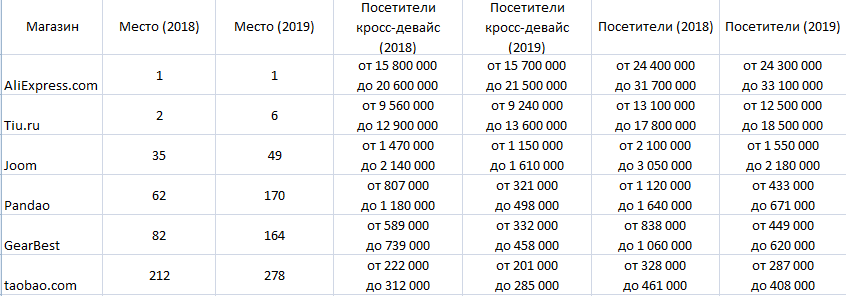 В таблице указаны места площадок в рейтинге крупнейших интернет-магазинов (по версии "Яндекс.Радара"), максимальная и минимальные оценки посетителей ресурса в месяц (цифры с учётом заходов одного посетителя с разных девайсов и браузеров и без учёта)