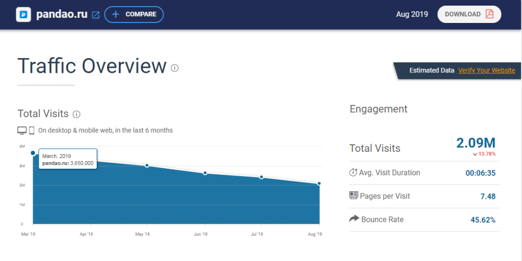 За последние полгода трафик площадки существенно просел. Только с марта он снизился в полтора раза (с 3 650 000 в марте до 2 090 000 в августе). А год назад, в октябре 2018 года месячная аудитория сайта составляла 4 707 000 посетителей.