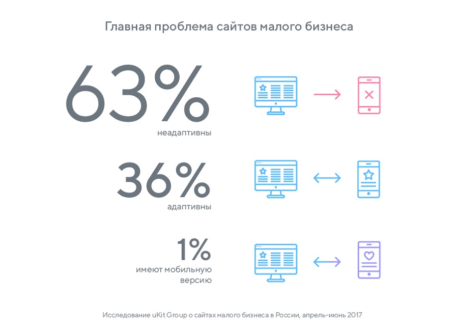 Результаты исследования оказались печальными: 63% сайтов малого бизнеса в России неадаптивны, веб-страницы некорректно отображаются на экранах мобильных устройств. Лишь у 1% сайтов существует мобильная версия.
