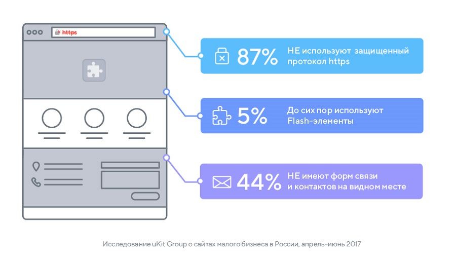 5% сайтов до сих пор используются flash-элементы, хоть эта технология и считается устаревшей. 87% сайтов не использует протокол HTTPS несмотря на то, что это может влиять на ранжирование сайта в поисковой выдаче и повышает доверие посетителей.