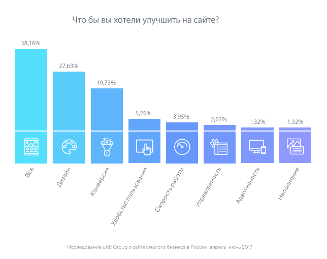 У многих ресурсов выявлены серьезные проблемы с дизайном: на 44% сайтов посетителям с большим трудом можно обнаружить контакты, время работы и форму обратной связи, хотя для бизнеса такие данные очень важны. У многих сайтов есть проблемы с навигацией, их страницы перегружены виджетами (что затрудняет работу с сайтом и отвлекает от контента).