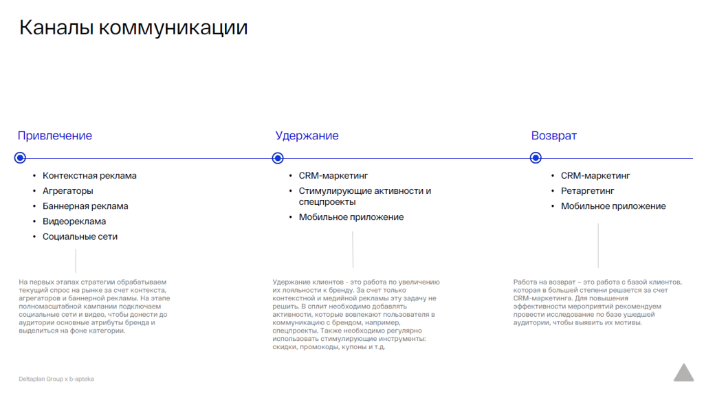 Пример: Так для одного из наших клиентов в нише аптечного ecom мы разработали LTV стратегию с делением аудитории на сегменты и по сезонным донесением до каждой аудитории уникальных УТП