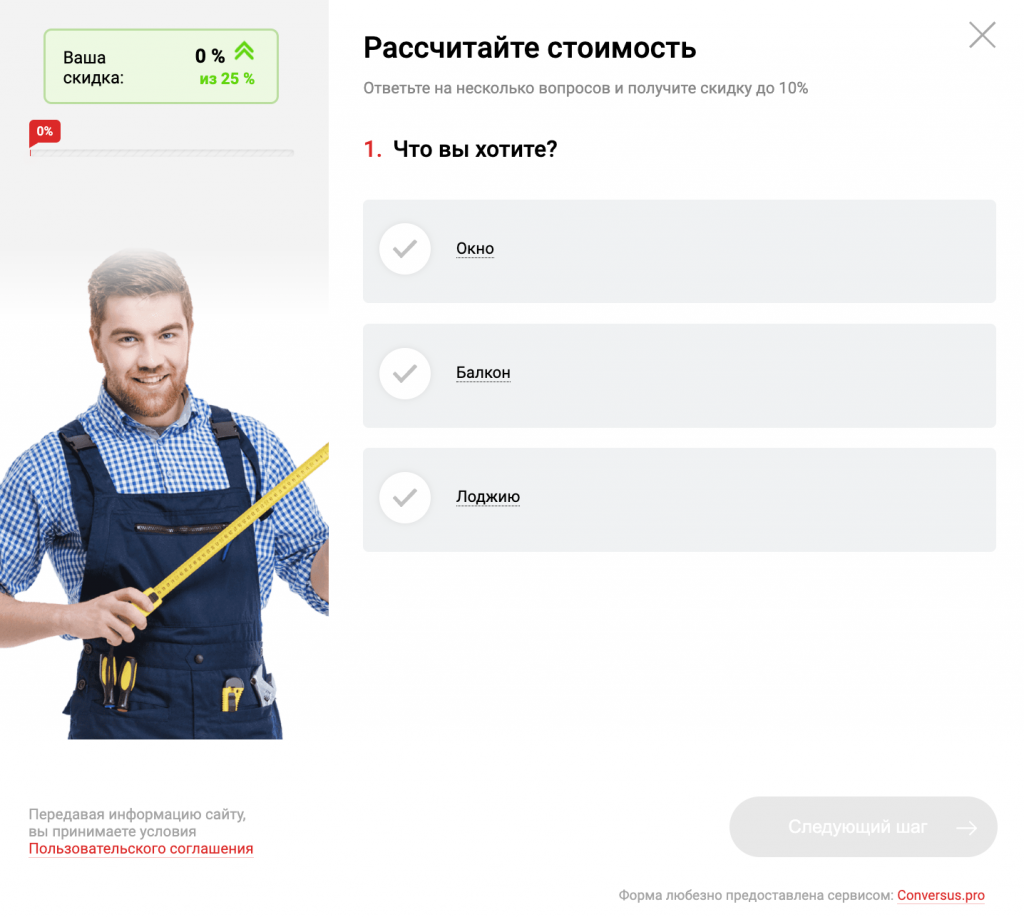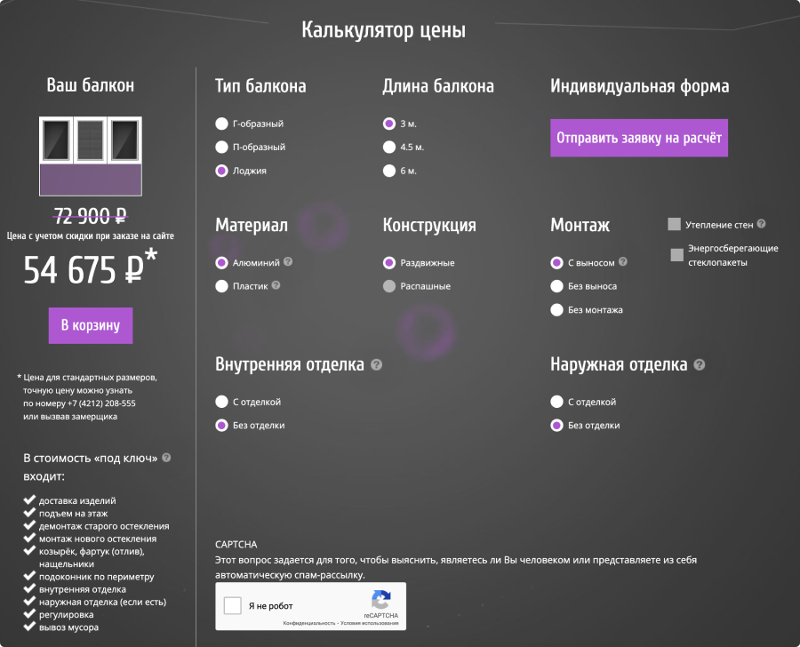 Калькулятор должен помогать клиентам с оформлением заявки, но из-за некомпетентности клиентов в некоторых вопросах установки окон, они не понимают, что нужно выбрать из предложенных вариантов и просто уходят. Скипнуть (пропустить) это действие на сайте нельзя.
