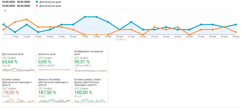 скрины со статистиками, на которых видны даты и названия целей (звонок, заявка с сайта).
