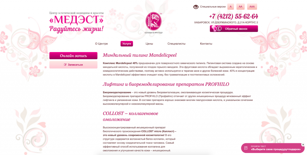 В некоторых B2C-нишах также есть свои особенности. Яркий пример — это бьюти-индустрия. Наш клиент — салон красоты в Хабаровске. Сайт разрабатывался много лет назад, он хорошо продвигается по SEO, но для контекстной рекламы не отвечает на запросы пользователей.