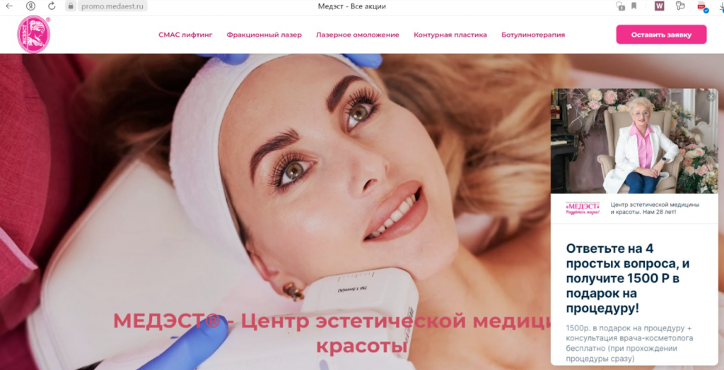 Для этого мы установили на основном сайте компании квиз, который дарит бесплатную консультацию с врачом-косметологом и бонус. С помощью консультации клиент поймет нужна ли ему данная процедура или ему порекомендуют другую, тем самым закроют его возражения и ответят на вопросы. А после он сразу может купить услугу со скидкой, что тоже само по себе приятно.