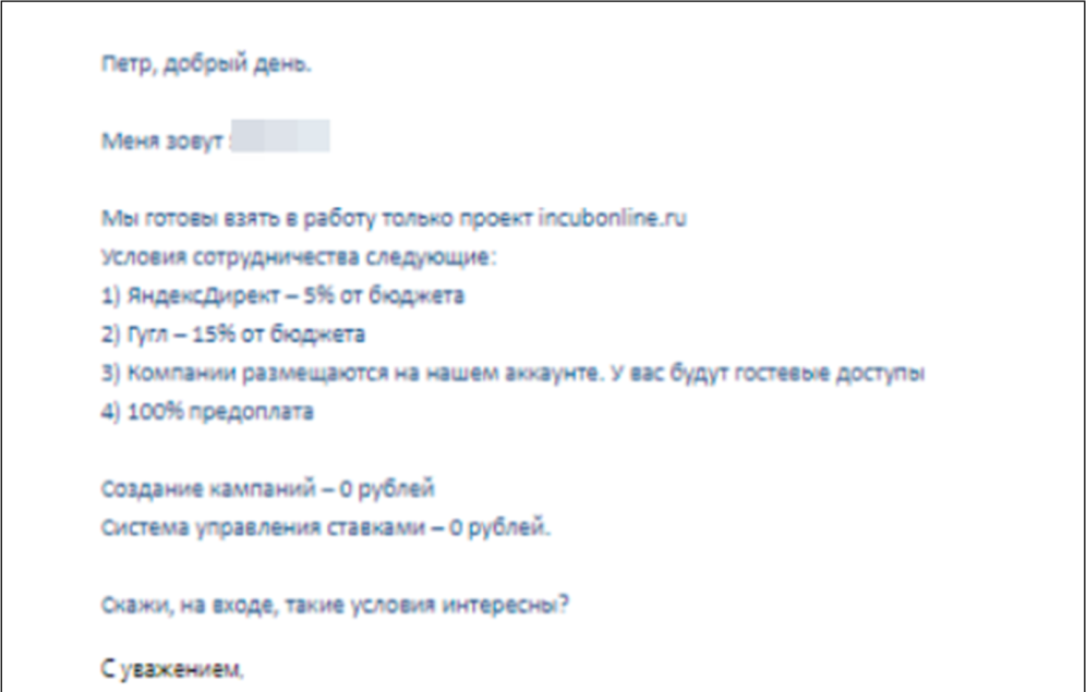 Процент от бюджета берут многие агентства, но обычно есть какой-то «оклад» по типу 10000 рублей за ведение рекламы плюс % от бюджета. В данном КП просто % и, скорее всего, агентство заинтересовано в том, чтобы открутить как можно больше вашего рекламного бюджета, чтобы заработать, так как настройка 0 рублей и система управления ставками 0 рублей. Также хотелось бы понимать, что конкретно они будут делать за свой процент от бюджета, должны быть расписаны функции. Например: