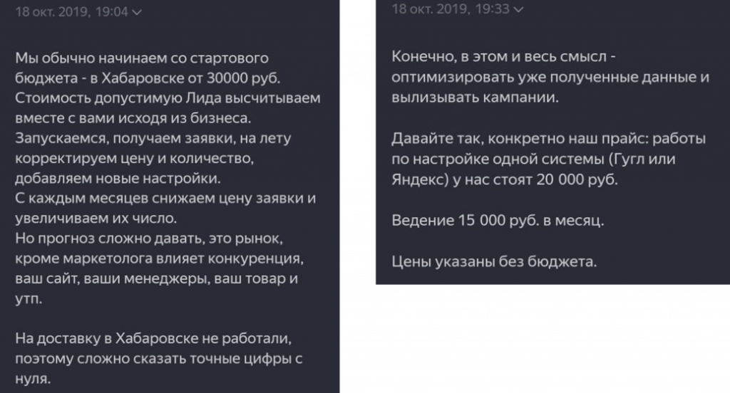 Здесь ребята придерживаются механики гипотез и тестов, то есть предлагают вначале запустить рекламу на 30к, а дальше посмотреть, как будет. Кажется, что у компании небольшой опыт, к тому же они честно пишут «на доставку в Хабаровске не работали». Но зато цены на их услуги при отсутствии гарантий (!) в рынке. Другими словами предложение такое: «вложите 65к, а дальше посмотрим, мож че-нить получится».