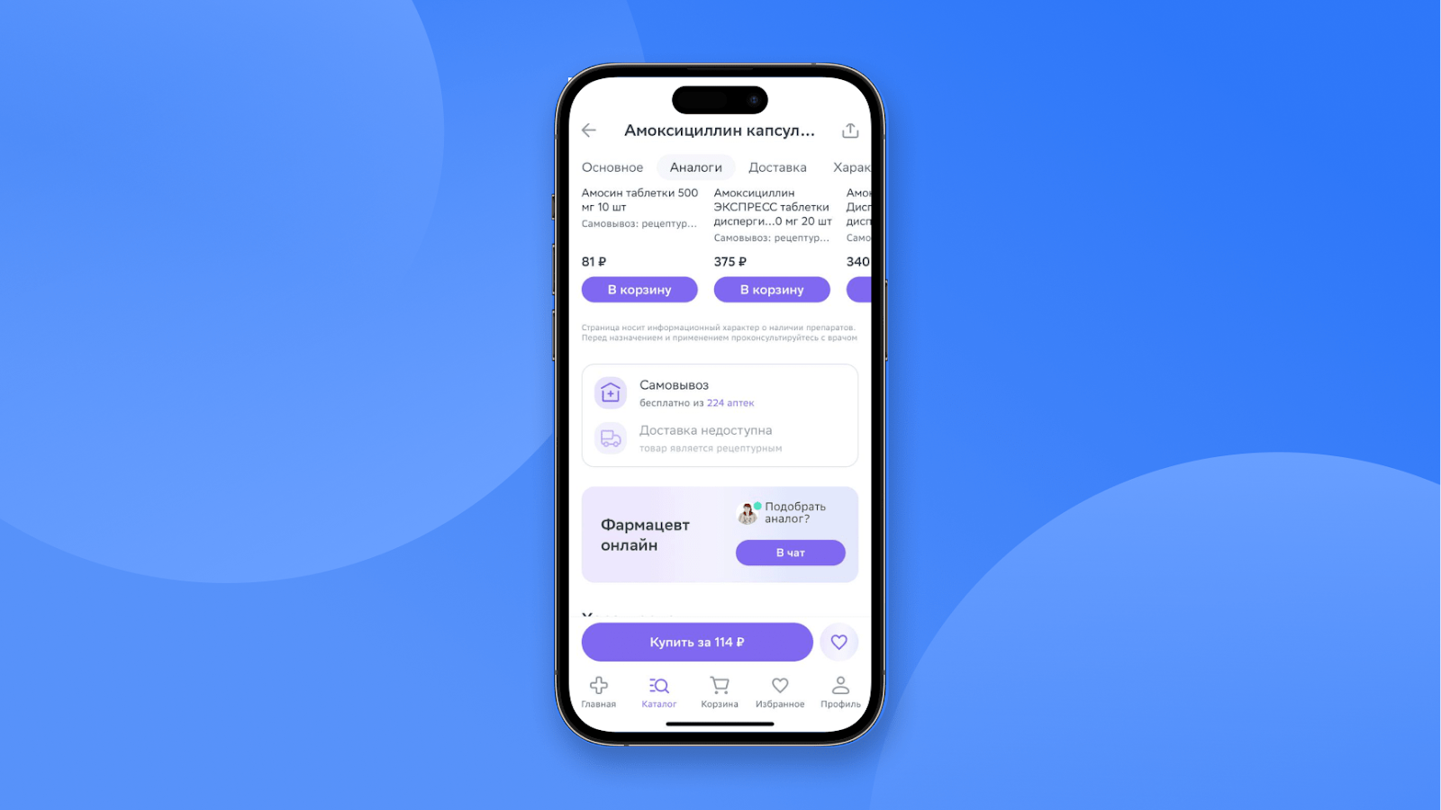 "Еаптека" в карточке товара показывает, в каких аптеках можно оформить самовывоз, а также почему доставка недоступна