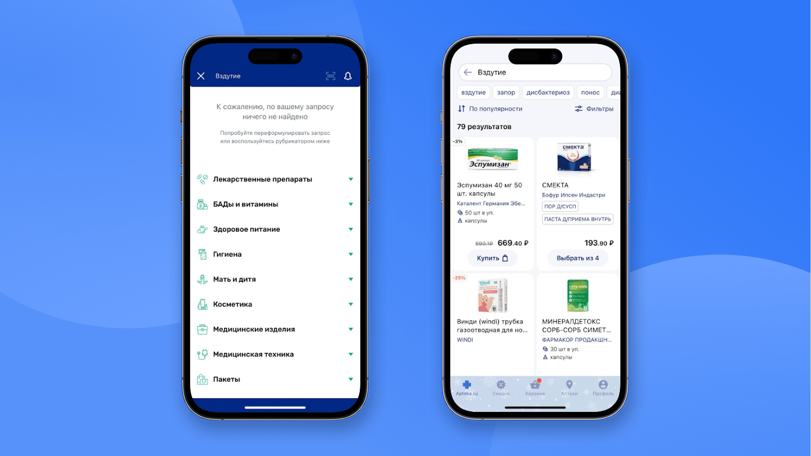 Поиск "Про Аптеки" бессилен против вздутия. Контрпример — поиск Apteka.ru, который не просто нашёл препараты по проблеме, но ещё и предлагает конкретизировать симптомы с помощью тегов