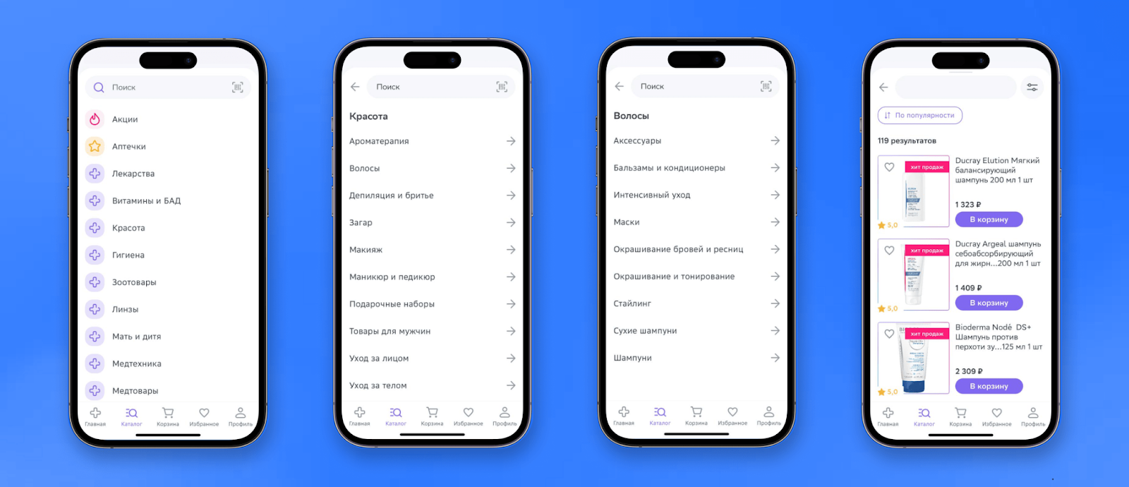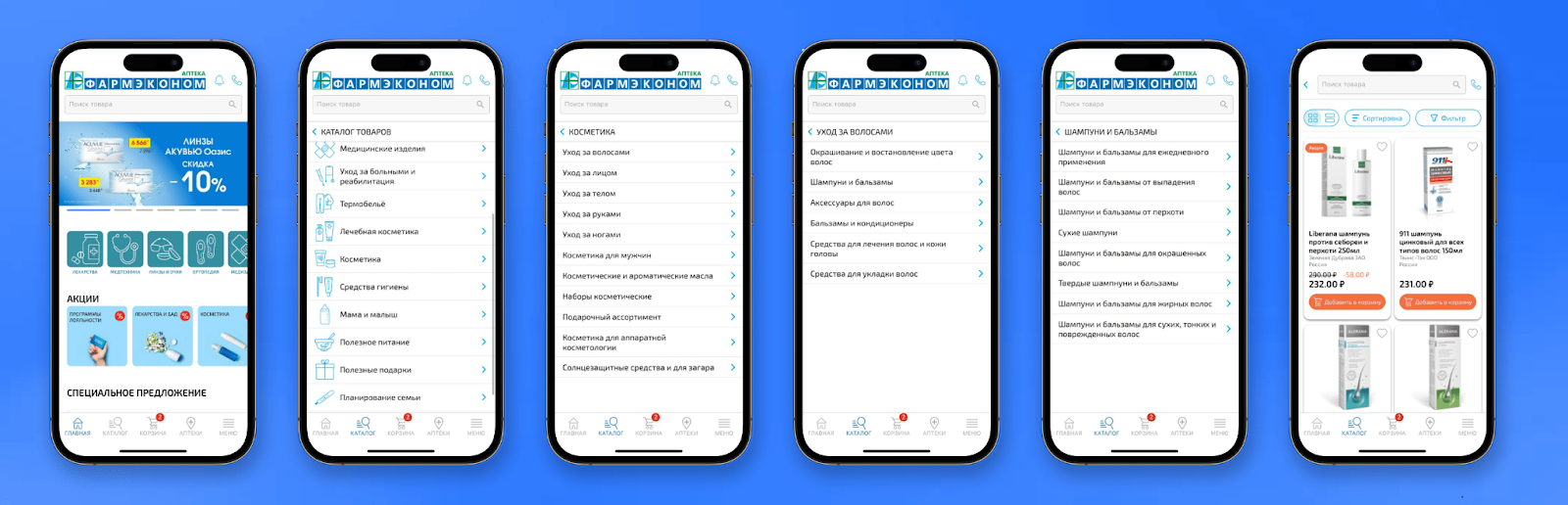 Пример Фармэконома. Чтобы добраться до шампуней и бальзамов, нужно сделать 4 клика