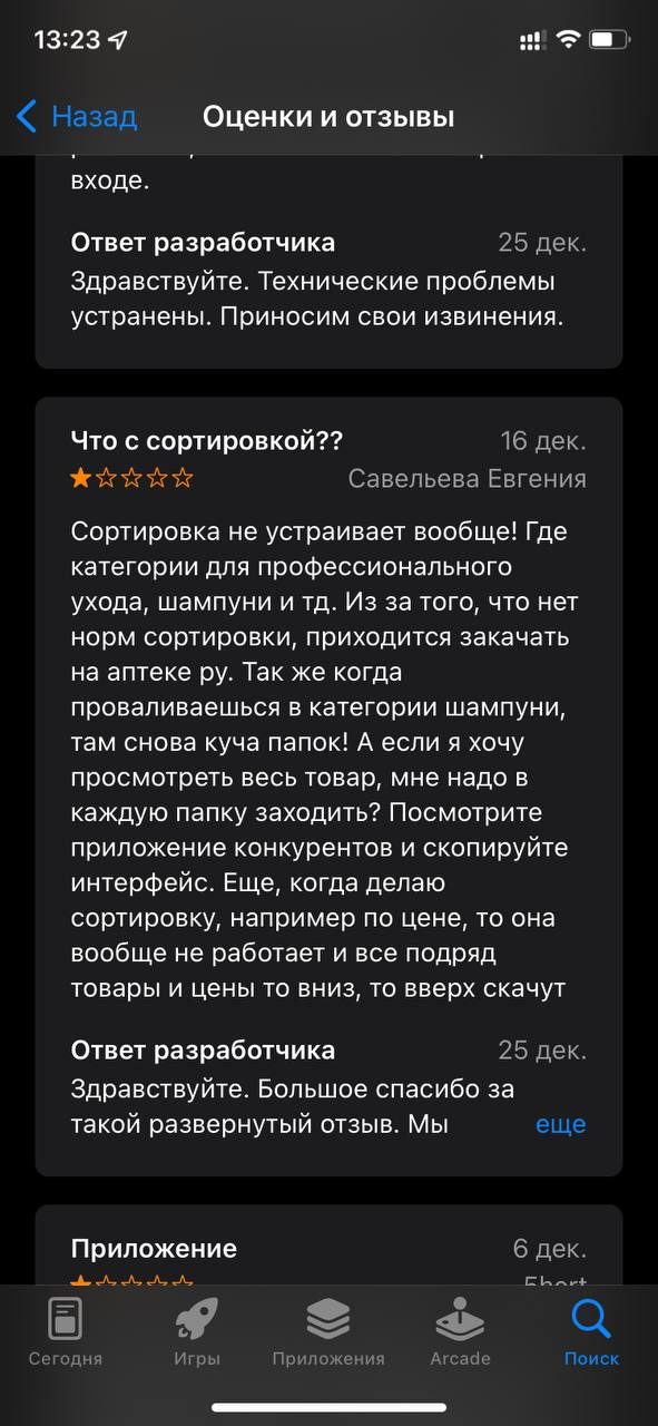 Но просто запустить мобильное приложение недостаточно. Для роста продаж важен хороший покупательский опыт. Пользователь должен быстро находить нужный товар, добавлять его в корзину и оформлять покупку. Желательно, чтобы этот сценарий происходил за минимальное количество действий. К сожалению, бывают кейсы, когда приложение буквально мешает потребителю завершить сделку. От этого его рейтинг падает. Каждая плохая оценка — это минус один клиент и даже больше, потому что кто-то не пошёл жаловаться и ушёл молча.