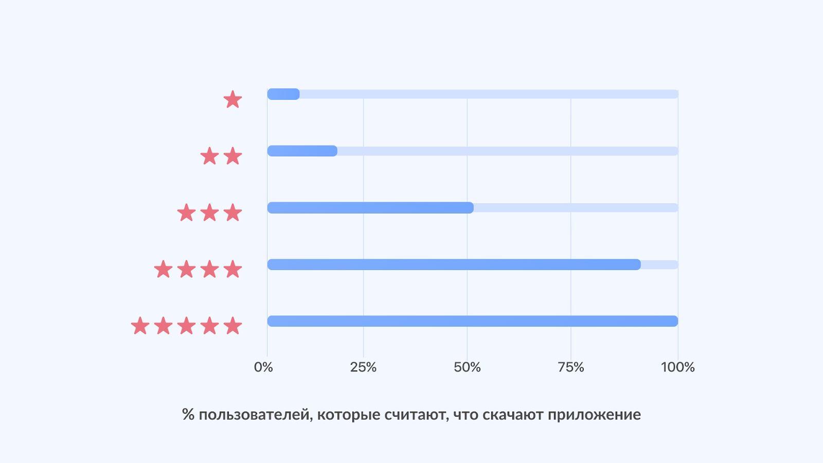 67% продаж в e-commerce происходит в мобильных приложениях. Но чтобы люди скачали приложение компании и что-то в нём купили, нужно следить за его рейтингом. Отчёт Alchemer Mobile утверждает, что половина пользователей проигнорируют приложение с рейтингом ниже четырёх звёзд. Больше 80% людей не станут скачивать сервис с оценкой ниже трёх звёзд.
