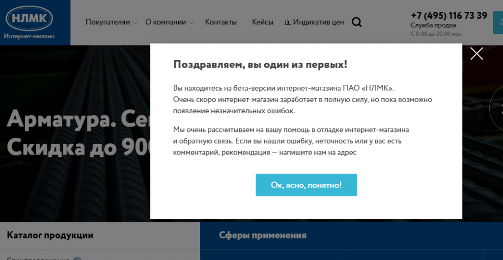 Пока что на главной странице магазина висит плашка, сообщающая, что площадка работает лишь в бета-версии.