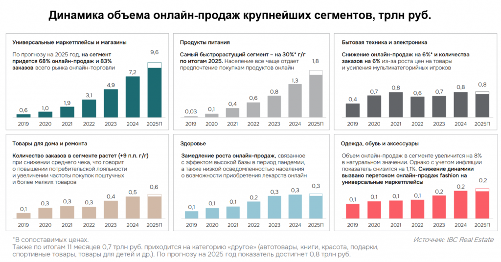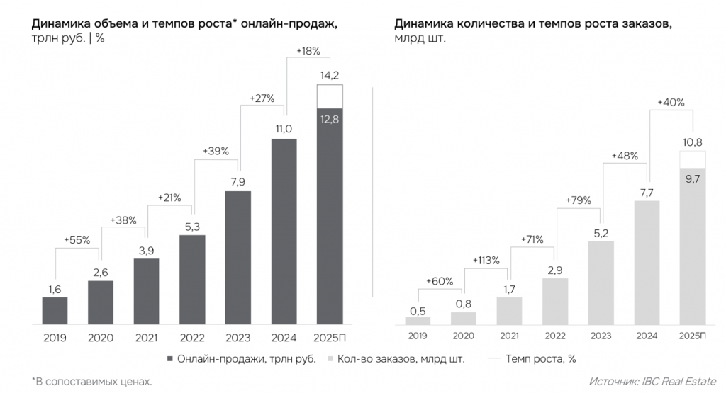 По данным консалтинговой компании IBC Real Estate, за январь-ноябрь 2025 года объем онлайн-продаж в России увеличился на 23% в сопоставимых ценах по сравнению с аналогичным периодом прошлого года и на конец ноября составил 12,8 трлн руб. По итогам 2025 года объем рынка электронной коммерции может достигнуть 14,2 трлн руб. (+18% г/г в сопоставимых ценах). Прогнозируемое снижение динамики темпов по итогам года относительно 11 месяцев обусловлено тем, что темп роста показателя рассчитан с учетом темпов роста инфляции. Увеличение денежного объема рынка электронной торговли сопровождается ростом количества заказов: за 11 месяцев 2025 года показатель достиг 9,7 млрд шт. (+38% г/г), а по итогам года может составить 10,8 млрд шт. (+40% г/г).