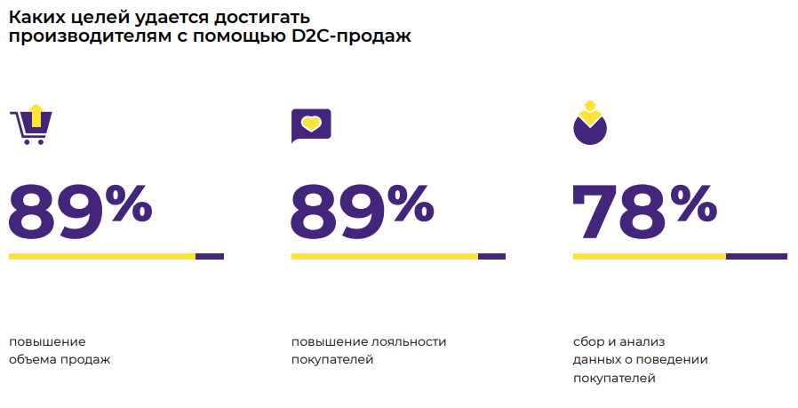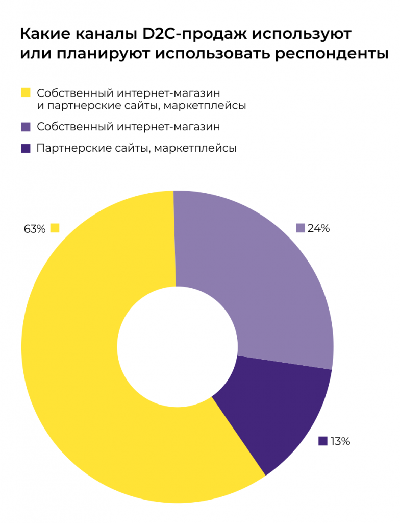 Впрочем, от маркетплейсов тоже отказываться не стоит. 63% респондентов, развивающих D2C-продажи, используют не только собственный интернет-магазин, но и большие площадки. Почти четверть опрошенных концентрируются на продажах на собственном сайте, а еще 13% предпочитают продавать именно на маркетплейсах.