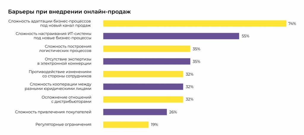 У большинства производителей до недавних пор не было опыта продажи своих товаров в розницу. В компаниях рассказывают, что для работы с конечным потребителем им приходится трансформировать многие бизнес-процессы. Именно этот момент 74% респондентов считают основным барьером при внедрении D2C-продаж.Многие производители технологически не готовы к автоматизации продаж. Больше половины респондентов отмечают сложность настраивания ИТ-системы под новые бизнес-процессы.