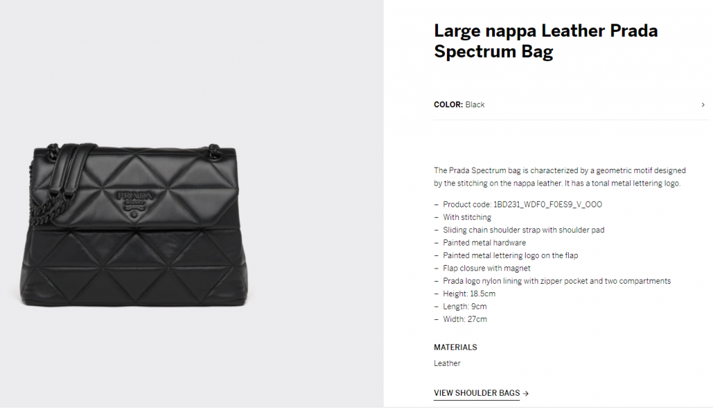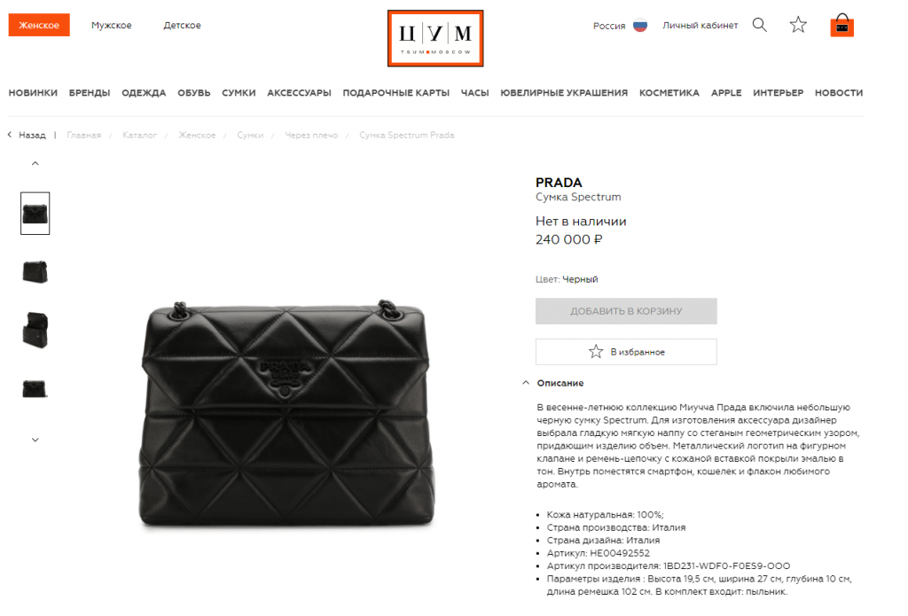 Вот, например, сумочка Large nappa Leather Prada Spectrum Bag от Prada. Сейчас их нет в продаже на сайте самого модного дома.