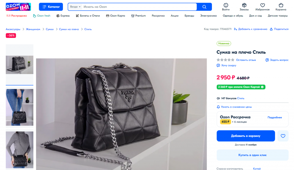На сайте Ozon, том самом, который попал в список двух самых "качественных" сайтов, с точки зрения Роскачества, на момент написания статьи такая сумка продавалась за 2 950 рублей, при этом если брать её через карту маркетплейса, то можно было получить 600 рублей скидку.