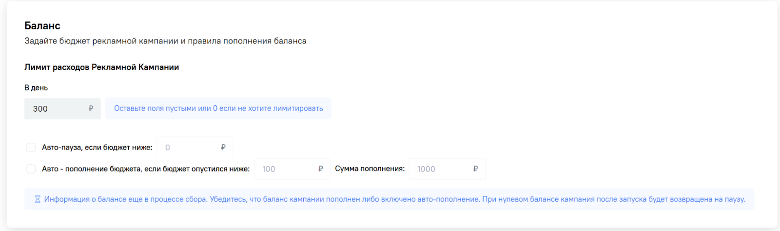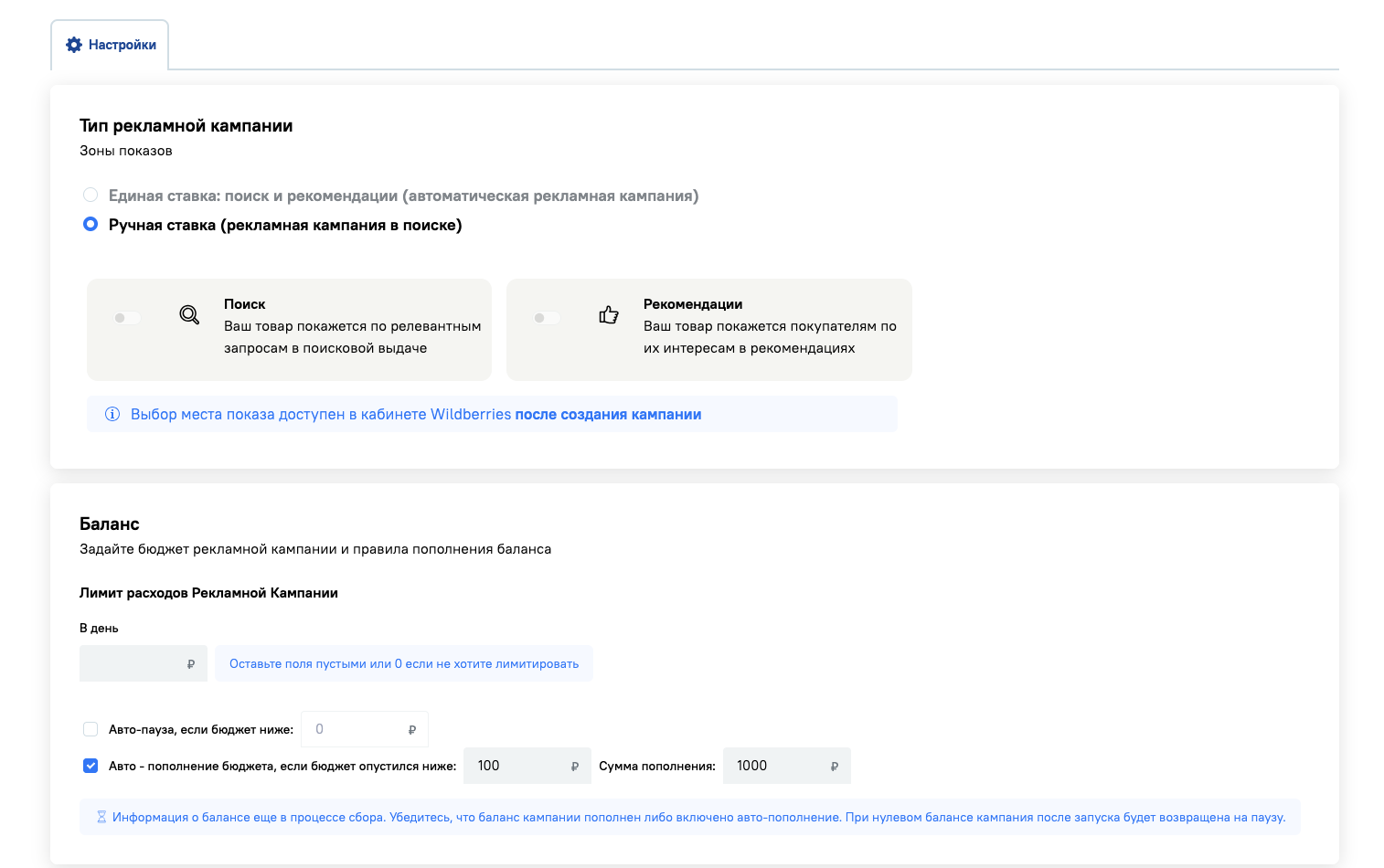 Селлер может задать дневной лимит расходов, а также включить автопополнение бюджета при снижении остатка ниже определённого значения — например, 500 рублей.
