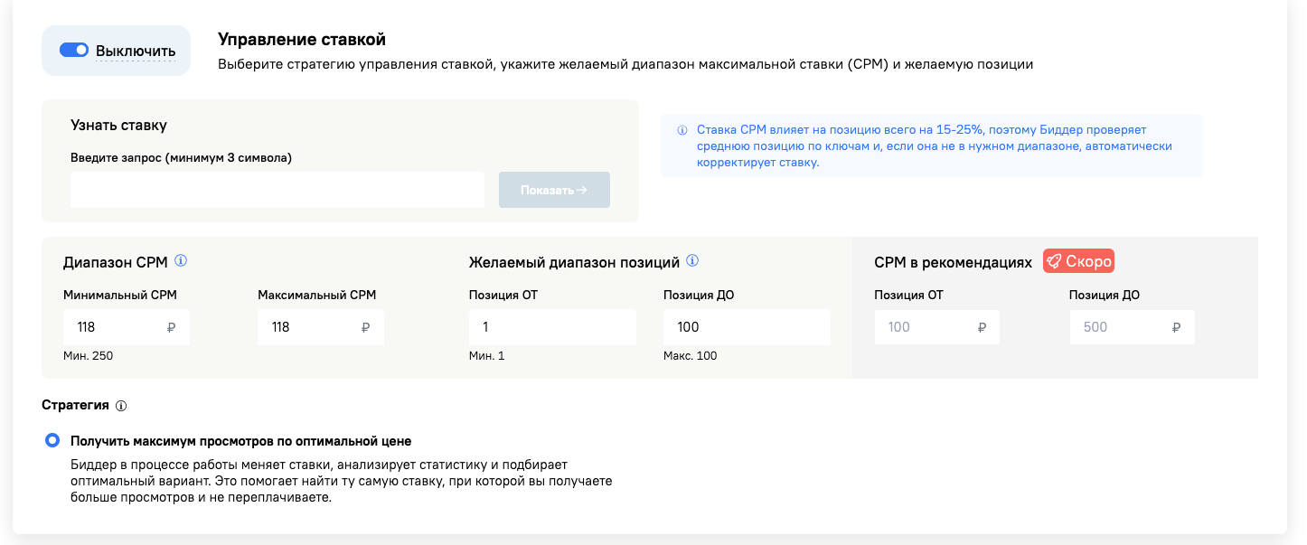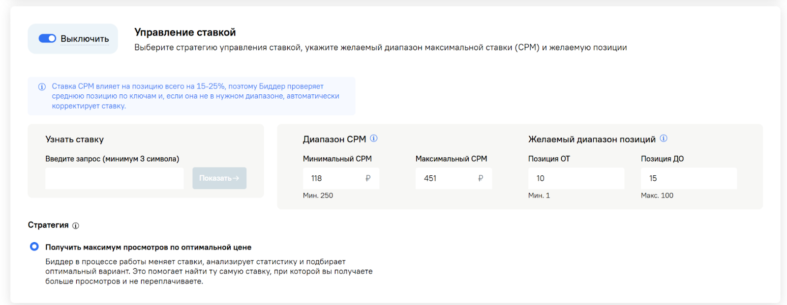 Ставки задаются в виде диапазона CPM — минимум и максимум. Зная свою юнит‑экономику, селлер может задать желаемые значения, чтобы не выходить за пределы рентабельности: